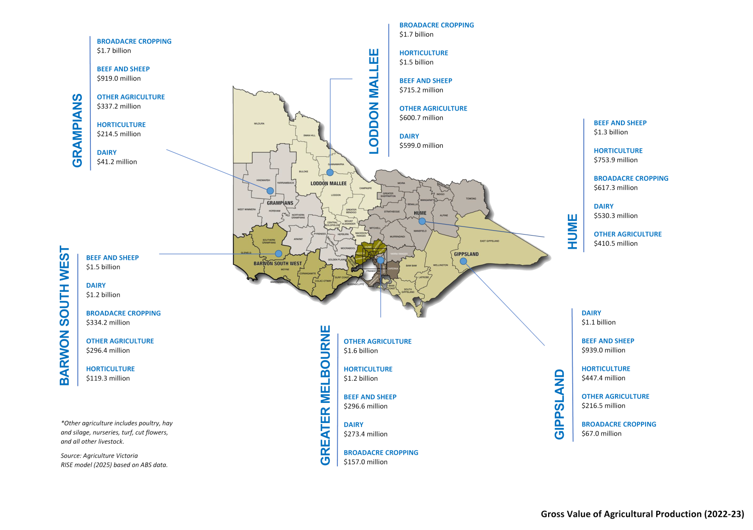 Grampians: Broadacre cropping ($1.7 billion) leads production, followed by beef and sheep ($919 million), other agriculture ($337.2 million), horticulture ($214.5 million) and dairy ($41.2 million).