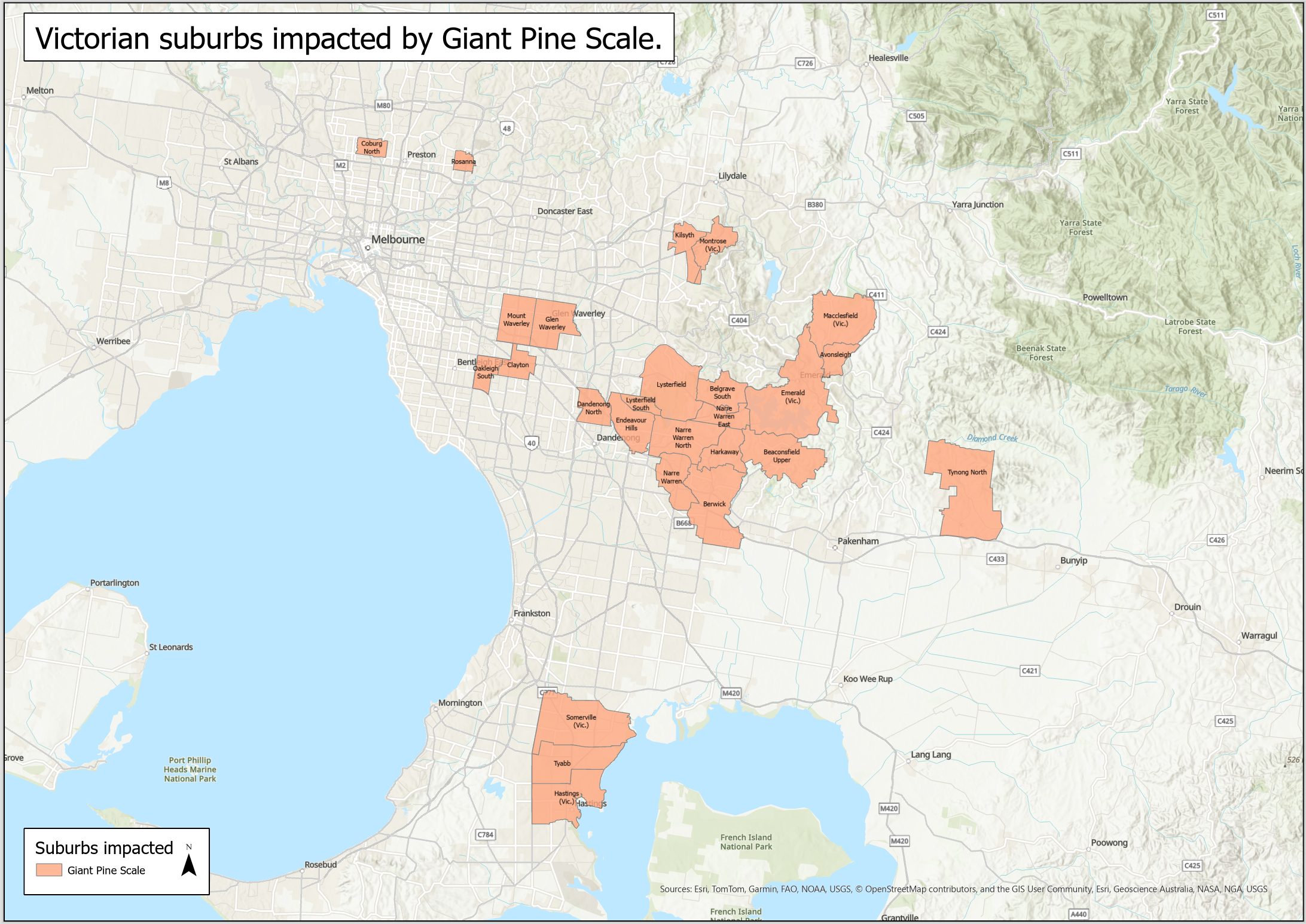 Infested trees are present in suburban Melbourne and current known areas of GPS infestation can be found on the map below (Figure 5).