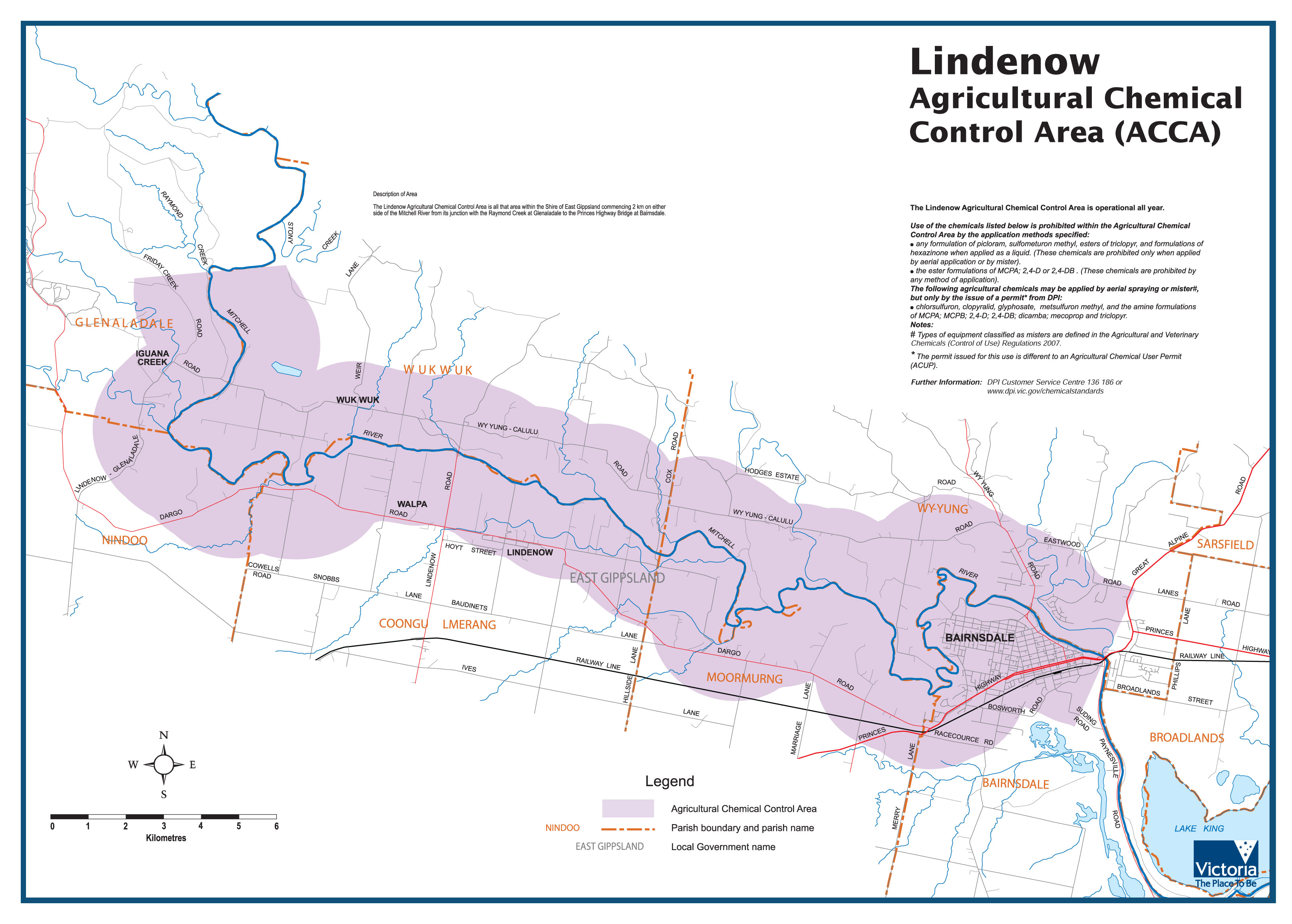 The Lindenow Agricultural Chemical Control Area is all that area within the Shire of East Gippsland commencing 2 kilometres on either side of the Mitchell River from its junction with the Raymond Creek at Glenaladale to the Princes Highway Bridge at Bairnsdale.