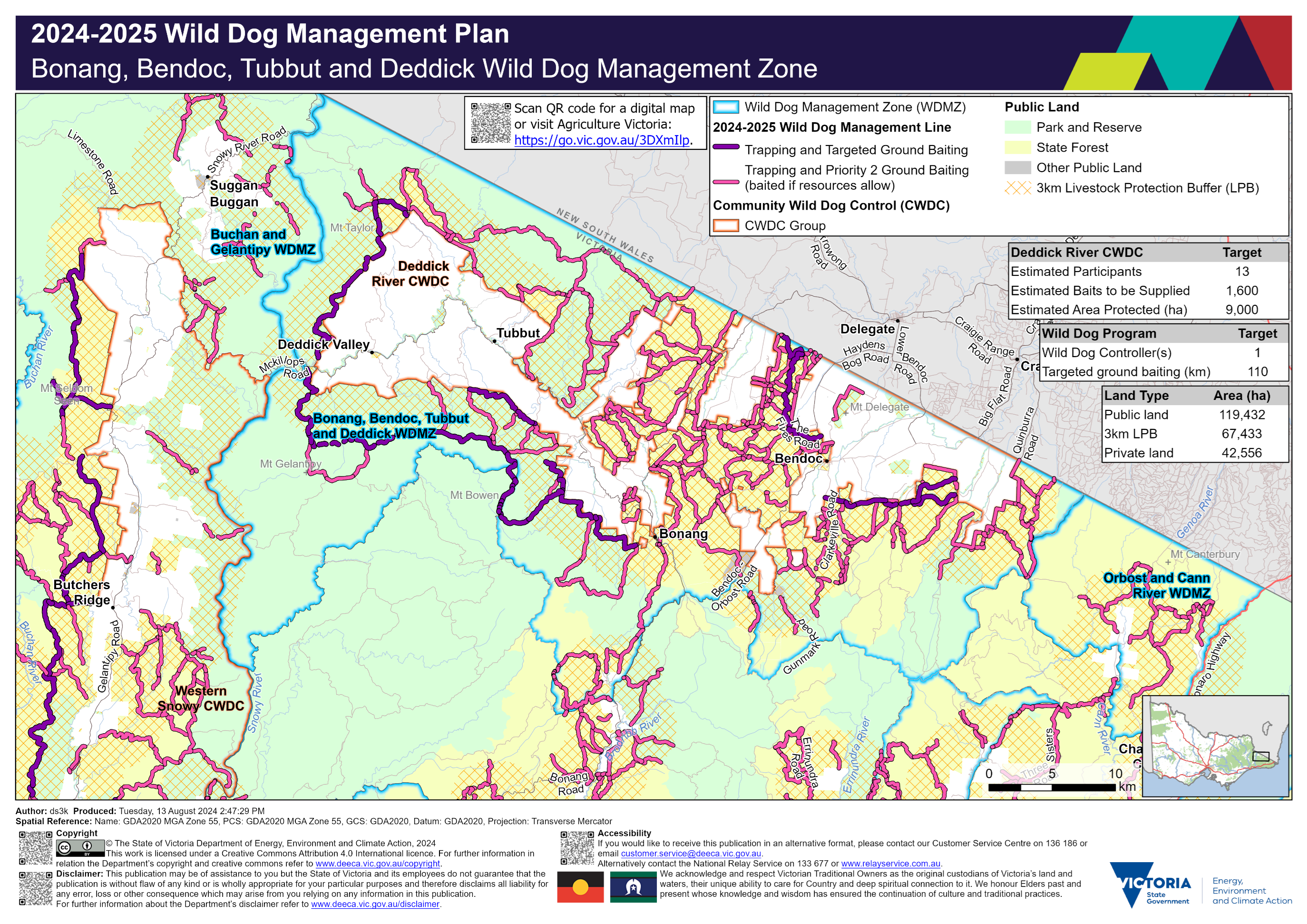 The Deddick River Community Vertebrate Species Control group covers all private land located within the Bonang, Bendoc, Tubbut and Deddick dingo predation management zone.