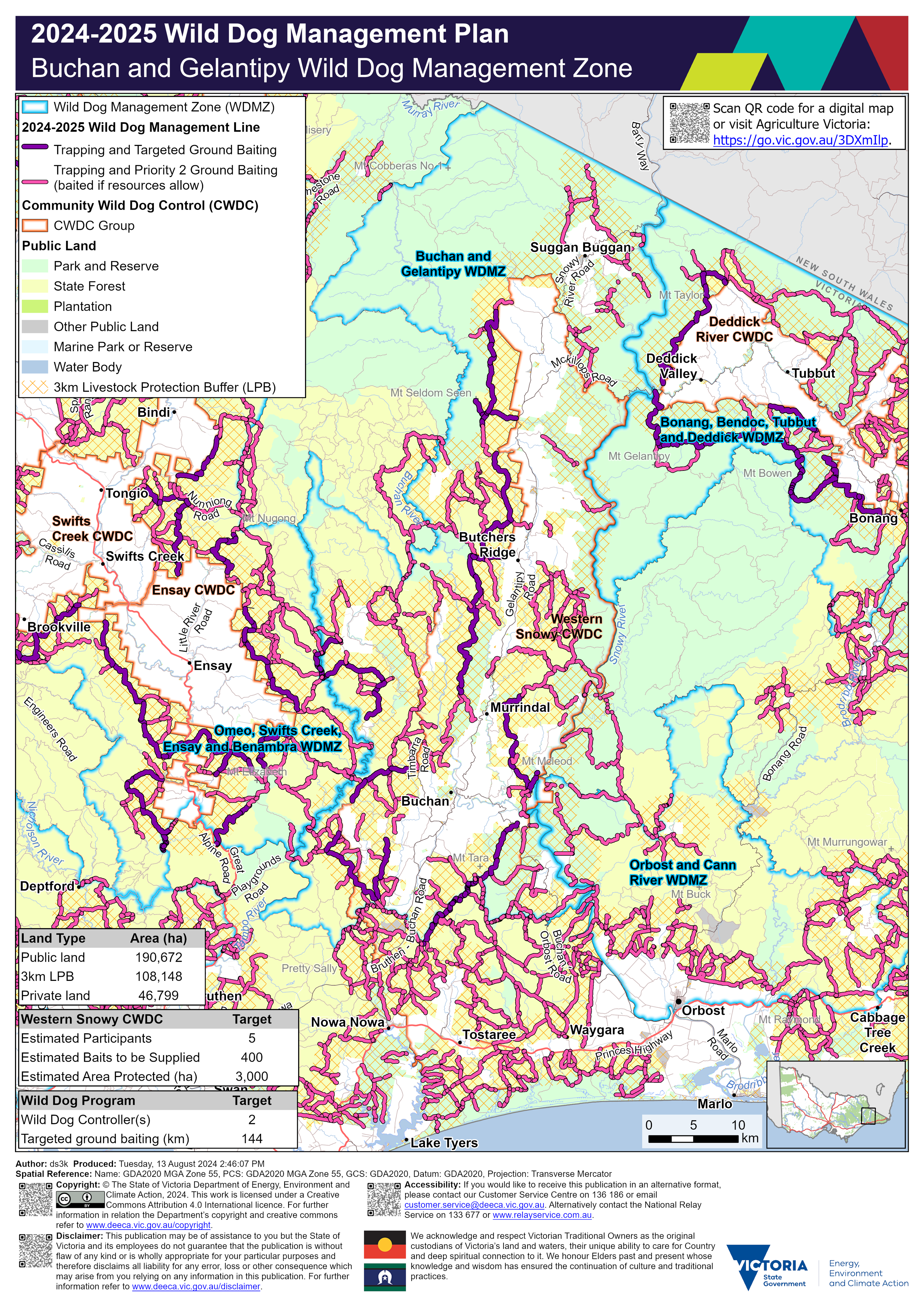 Within the Buchan and Gelantipy dingo predation management zone there is 190,672 hectares of public land, 108,148 hectares of land under the 3 km livestock protection buffer and 46,799 hectares of private land. There are 2 Vertebrate Species Management Officers and 109 km of targeted ground baiting transects.