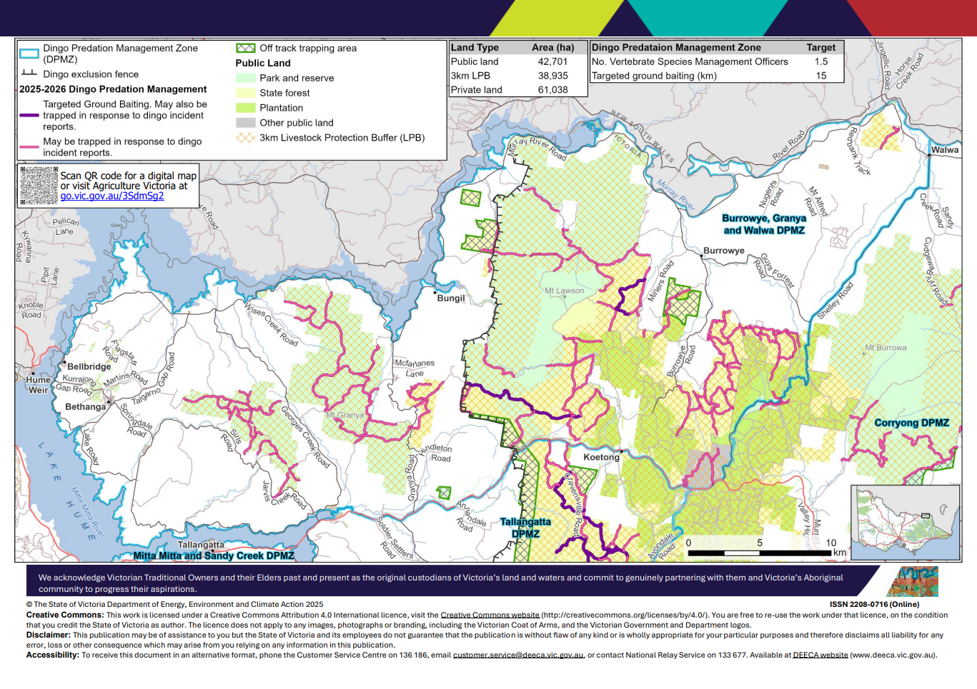 Within the Burrowye, Granya and Walwa dingo predation management zone there is 42,701 hectares of public land, 38,935 hectares of land under the 3 km livestock protection buffer and 61,038 of private land. There are 2 Vertebrate Species Management Officers, and 15 km of targeted ground baiting transects.