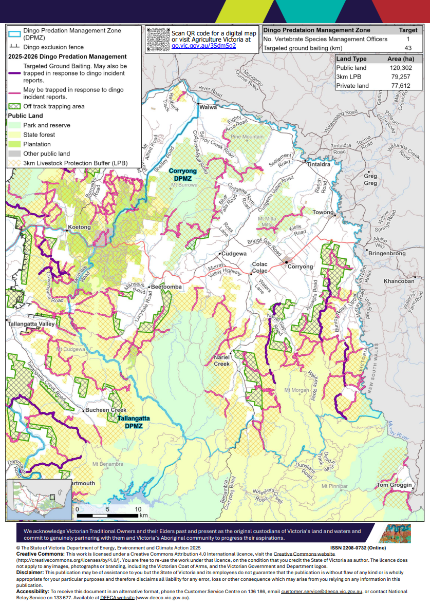 The map shows within the Corryong dingo predation management zone there is 120,302 hectares of public land, 79,257 hectares of land under the 3 km livestock protection buffer and 77,612 hectares of private land. There is one Vertebrate Species Management Officer, and 43 km of targeted ground baiting transects.
