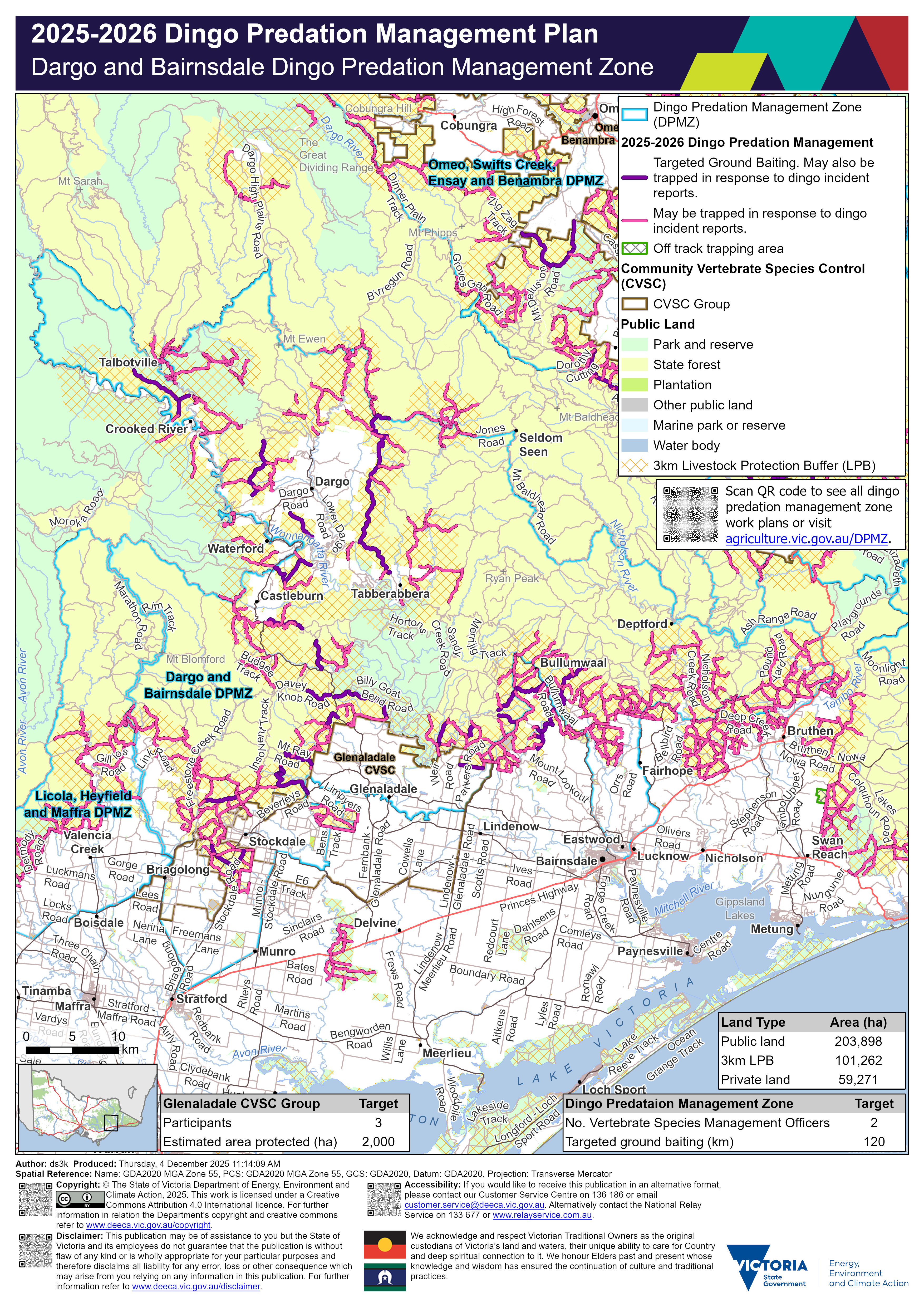 There is one community Vertebrate Species control group located within the Dargo and Bairnsdale dingo predation management zone. The Glenaladale Community Vertebrate Species Control group includes private land near Briagolong, Stockdale and Glenaladale.