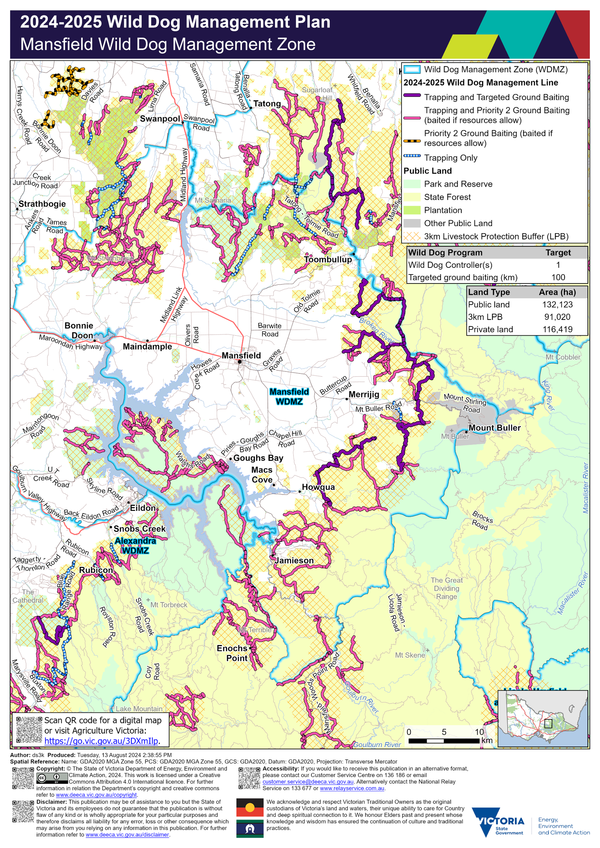 The map shows within the Mansfield dingo predation management zone there is 132,123 hectares of public land, 91,020 hectares of land under the 3 km livestock protection buffer and 116,419 hectares of private land. There is one Vertebrate Species Management Officer and 50 km of targeted ground-baiting transects.