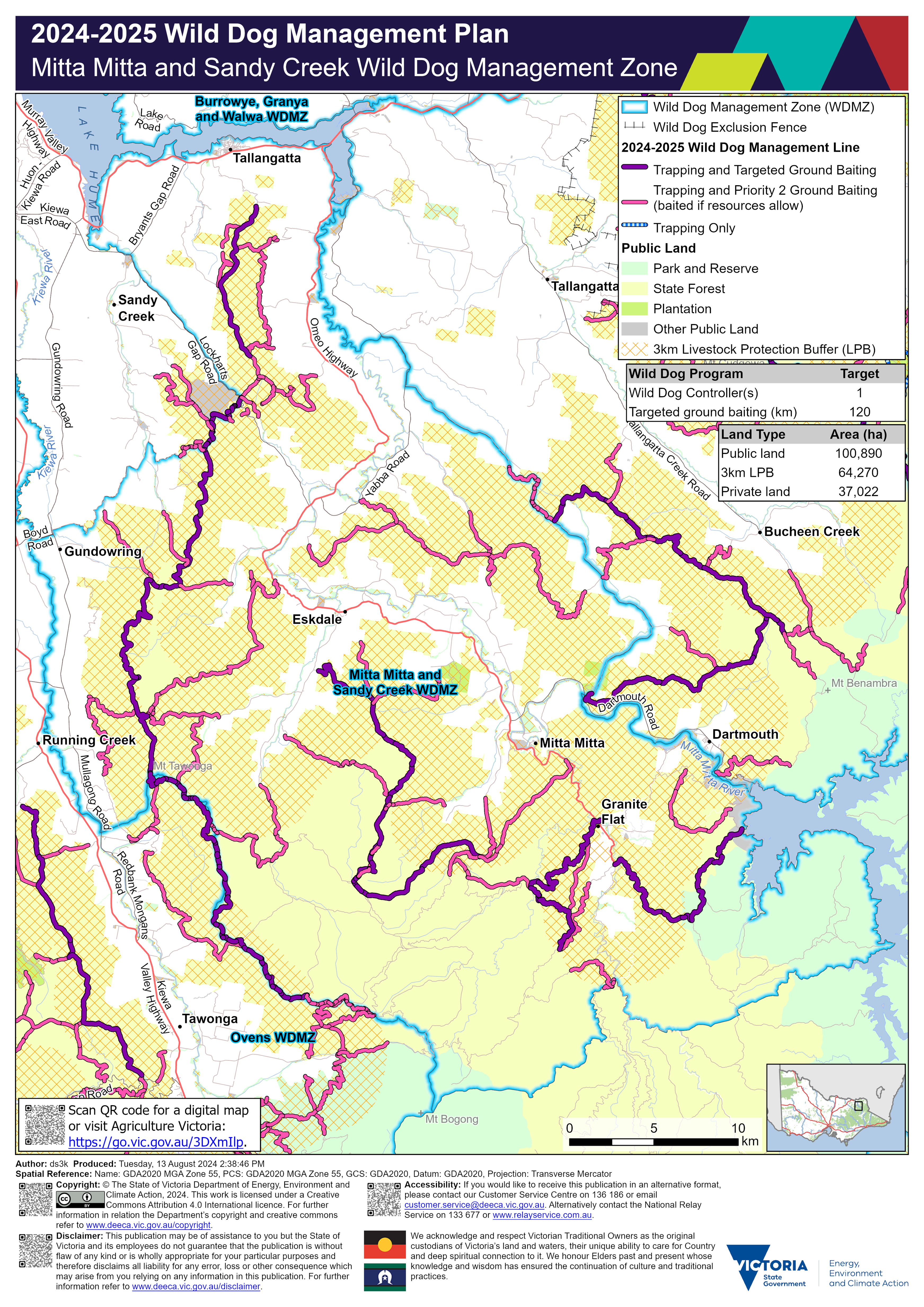 The map shows within the Mitta Mitta and Sandy Creek dingo predation management zone there is 100,890 hectares of public land, 64,270 hectares of land under the 3 km livestock protection buffer and 37,022 hectares of private land. There is one Vertebrate Species Management Officer and 59 km of targeted ground baiting transects.