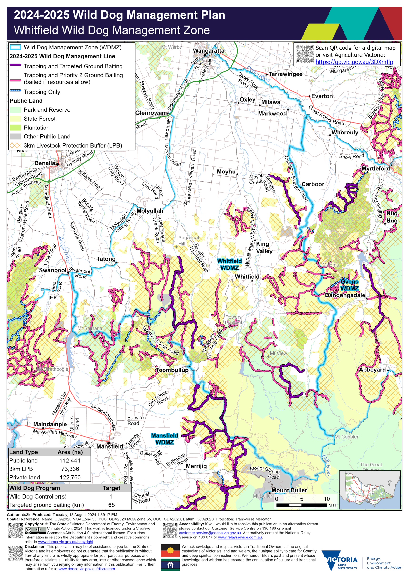 Within the Whitfield dingo predation management zone there is 112,441 hectares of public land, 73,336 hectares of land under the 3 km livestock protection buffer and 122,760 hectares of private land. There is one Vertebrate Species Management Officer and 22 km of targeted ground baiting transects.