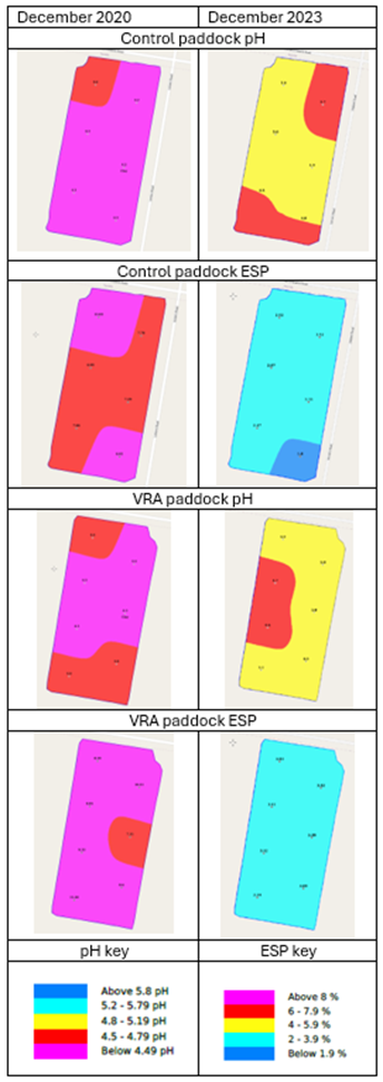 Soil targets for the site included increasing pH to 5.5 and reducing exchangeable sodium percentage (ESP) to less than 6%. The paddock treatments included: